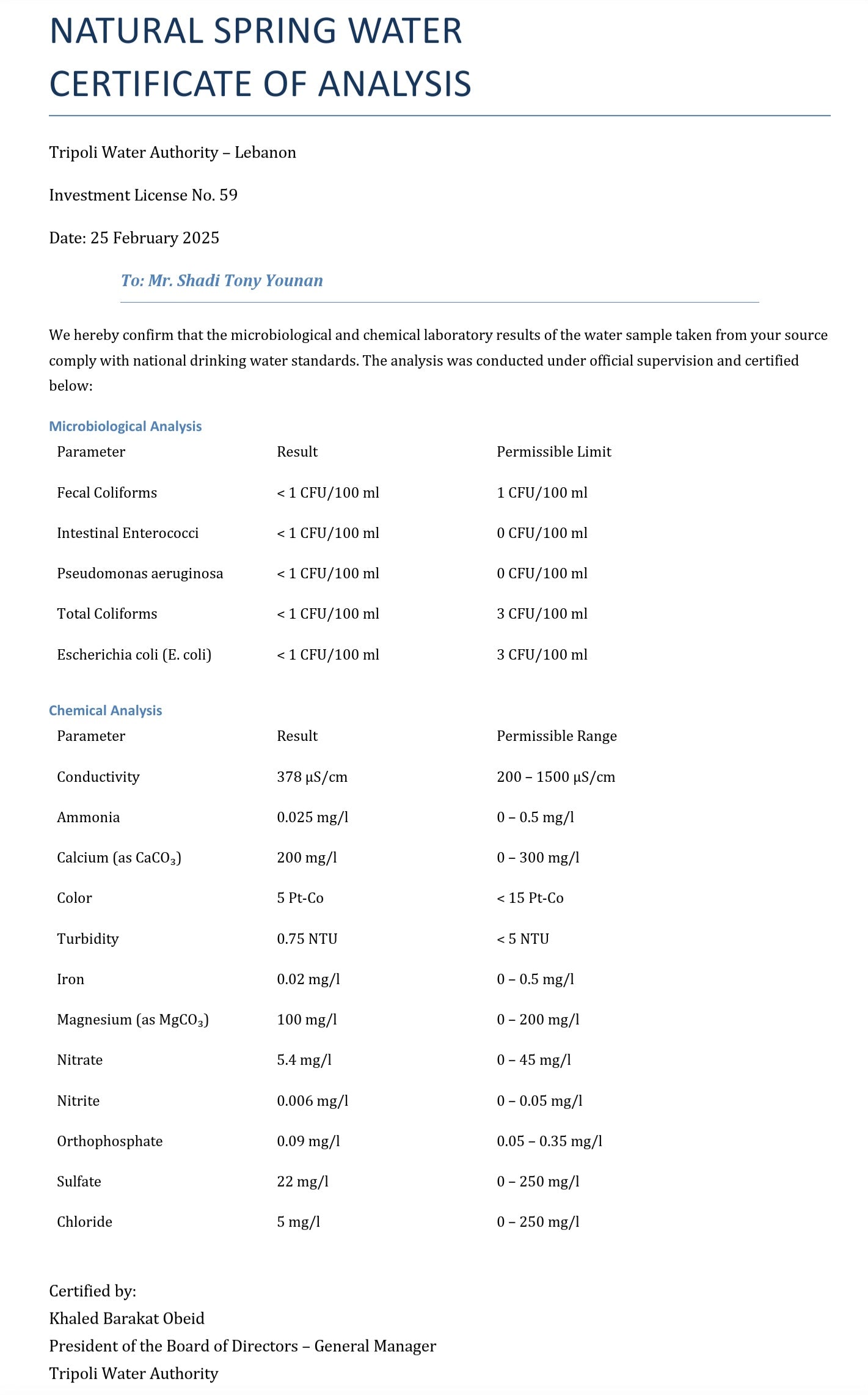 My Qannoubine is a functional, living water — designed by nature to meet human biological needs. With rare concentrations of bioavailable minerals, it supports optimal health, hydration, and cellular energy with zero intervention. This is not water enhanced by man — this is water perfected by the valley itself.